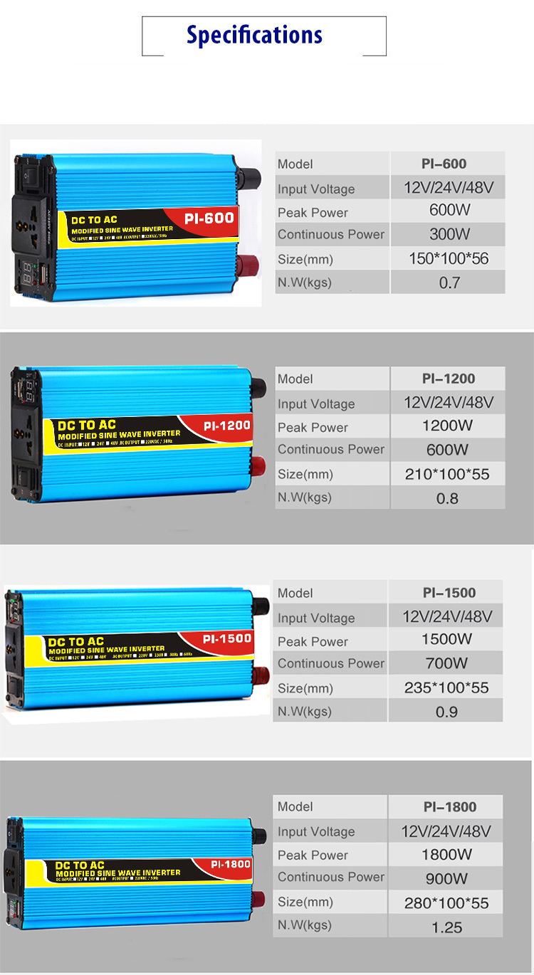 600W, 1200W,1500W, 1800W 12V 24V 48V to 220V modified sine wave power inverters for power tools, fan, lights, bulbs, TV, computers