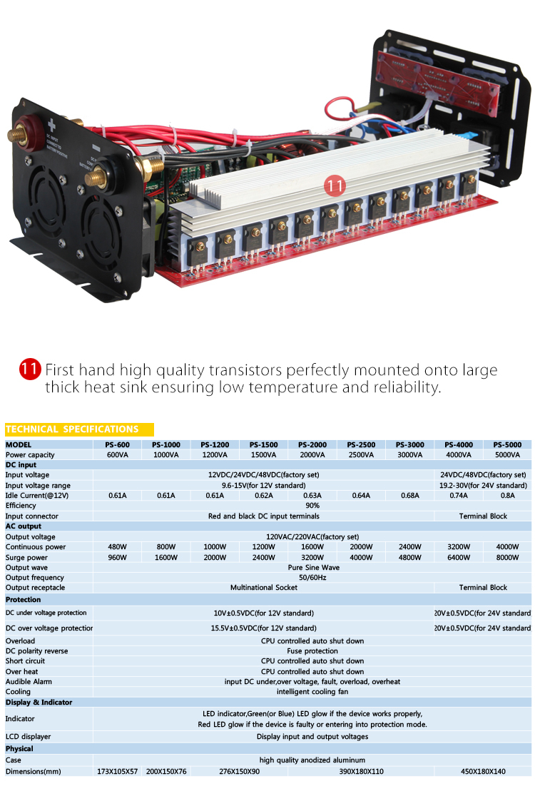 | Power capacity | 500VA | 1000VA | 1200VA | 1500VA | 2000VA | 2500VA | 3000VA | 4000VA | 5000VA |