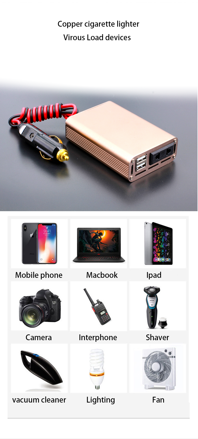 fanless, noiseless 150W car inverter with cigarette plug,1x AC socket and 2 fast charger USB ports